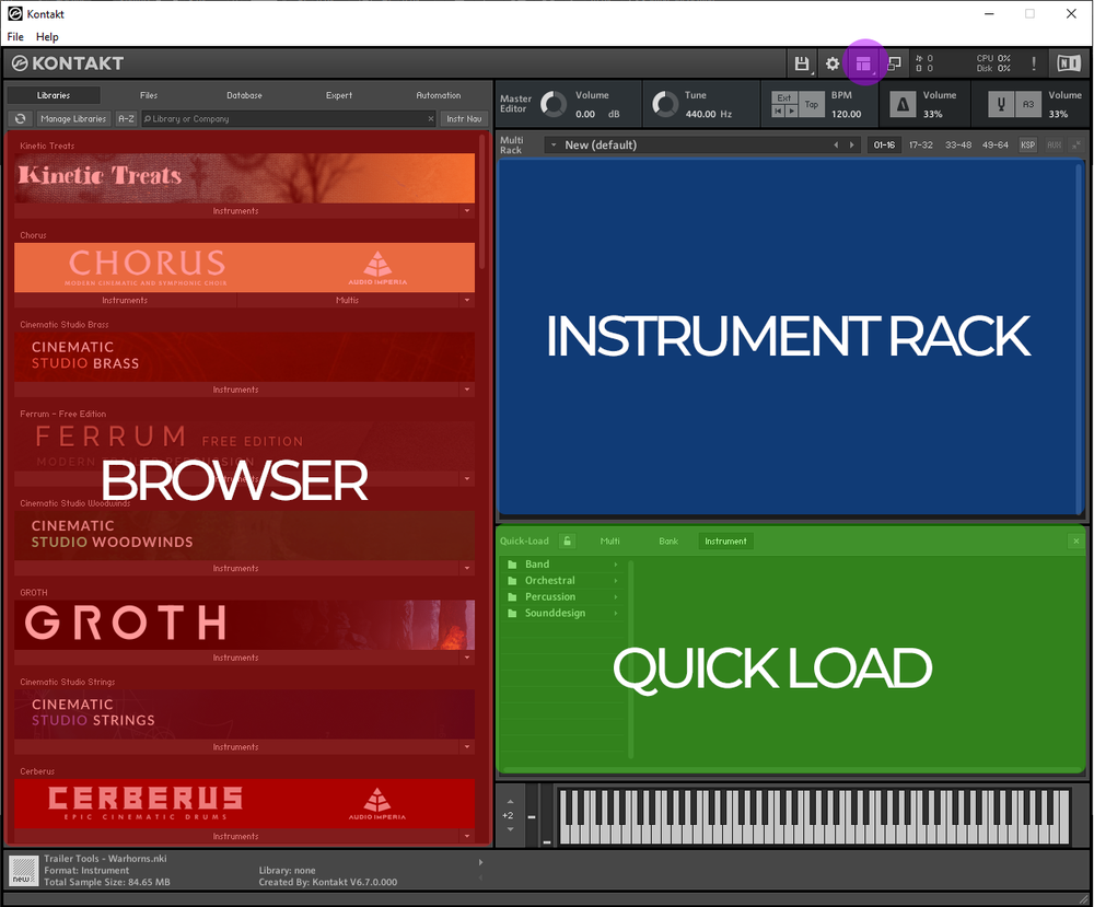 Open up the quick load window by right-clicking on the instrument rack, or clicking on the view button (marked in purple). Here, you can add all third party instruments that are not developed through Native Instruments. Actually, I prefer using this, as I can put everything into custom folders.